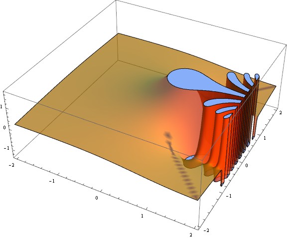 Plot3D[Im@MittagLefflerE[1/4, u + I v], {u, -2, 2}, {v, -2, 2}, Mesh -> None, PlotStyle -> Directive[Opacity[0.7], Orange], ImageSize -> Large, PlotPoints -> 50]