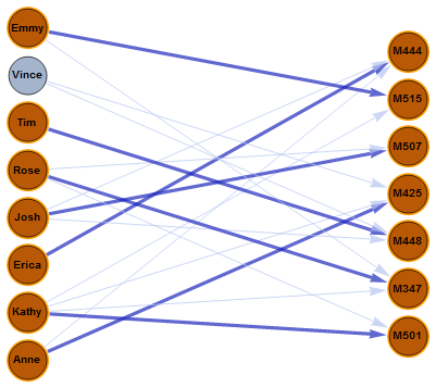 A math department would like to offer seven courses. There are eight professors, each of whom is willing to teach certain courses. Find a maximal matching where professors only teach courses they are interested in teaching.