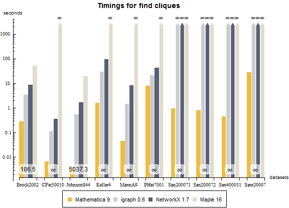 Compare timings for computing cliques for graphs. Experiments were performed on an Intel Core 2 Duo 3.06 GHz Mac OS X Lion system, with a time limit of 1000 seconds. The number at the bottom tells how many times faster Mathematica 9 is compared to Maple 16.
