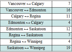 A railroad network serving six major Canadian cities, with the daily number of car compartments.