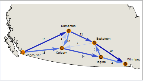 g = \!\(\* GraphicsBox[ NamespaceBox["NetworkGraphics", DynamicModuleBox[{Typeset`graph = HoldComplete[ Graph[{"Vancouver", "Calgary", "Edmonton", "Regina", "Saskatoon", "Winnipeg"}, {{{1, 2}, {1, 3}, {2, 3}, {3, 2}, {2, 4}, {3, 5}, {5, 2}, {4, 5}, {4, 6}, {5, 6}}, Null}, { EdgeCapacity -> {13, 16, 4, 10, 14, 12, 9, 7, 4, 20}, EdgeLabels -> { DirectedEdge["Saskatoon", "Calgary"] -> Placed[ 9, {0.5, {0.5, 0}}], DirectedEdge["Edmonton", "Saskatoon"] -> Placed[ 12, {0.5, {0.5, 0}}], DirectedEdge["Edmonton", "Calgary"] -> Placed[ 10, {0.5, {-0.2, 1}}], DirectedEdge["Vancouver", "Edmonton"] -> Placed[ 16, {0.5, {1, 0}}], DirectedEdge["Saskatoon", "Winnipeg"] -> Placed[ 20, {0.5, {0, 0}}], DirectedEdge["Calgary", "Regina"] -> Placed[ 14, {0.6, {1, 1.5}}], DirectedEdge["Calgary", "Edmonton"] -> Placed[ 4, {0.3, {1, 0}}], DirectedEdge["Regina", "Saskatoon"] -> Placed[ 7, {0.3, {3, 0}}], DirectedEdge["Regina", "Winnipeg"] -> Placed[ 4, {0.5, {1, 1.5}}], DirectedEdge["Vancouver", "Calgary"] -> Placed[ 13, {0.6, {1, 1.5}}]}, GraphStyle -> "BasicBlack", ImagePadding -> {{0, 40}, {0, 10}}, VertexCoordinates -> {{-0.253, 0.112}, {-0.1419, 0.1239}, {-0.122, 0.1735}, {-0.02976, 0.0981}, {-0.0486, 0.139}, {0.03968, 0.07923}}, VertexLabels -> { "Winnipeg" -> Placed[ "Winnipeg", Automatic, Style[#, FontFamily -> "Helvetica"]& ], "Edmonton" -> Placed[ "Edmonton", Above, Style[#, FontFamily -> "Helvetica"]& ], "Vancouver" -> Placed[ "Vancouver", {{1.5, -1}, {0, 0}}, Style[#, FontFamily -> "Helvetica"]& ], "Saskatoon" -> Placed[ "Saskatoon", Automatic, Style[#, FontFamily -> "Helvetica"]& ], "Calgary" -> Placed[ "Calgary", Below, Style[#, FontFamily -> "Helvetica"]& ], "Regina" -> Placed[ "Regina", Below, Style[#, FontFamily -> "Helvetica"]& ]}, VertexSize -> {Medium}}]], Typeset`boxes, Typeset`boxes$s2d = GraphicsGroupBox[{{ Arrowheads[0.05043608380268435], { TagBox[ StyleBox[ ArrowBox[{ DynamicLocation["VertexID$1", Automatic, Center], DynamicLocation["VertexID$2", Automatic, Center]}], Directive[ GrayLevel[0], Opacity[0.7]], StripOnInput -> False], "DynamicName", BoxID -> "EdgeLabelID$1"], InsetBox[ FormBox["13", TraditionalForm], Offset[{0, 2}, DynamicLocation["EdgeLabelID$1", Automatic, Scaled[0.6]]], ImageScaled[{1, 1.5}], BaseStyle -> "Graphics"]}, { TagBox[ StyleBox[ ArrowBox[{ DynamicLocation["VertexID$1", Automatic, Center], DynamicLocation["VertexID$3", Automatic, Center]}], Directive[ GrayLevel[0], Opacity[0.7]], StripOnInput -> False], "DynamicName", BoxID -> "EdgeLabelID$2"], InsetBox[ FormBox["16", TraditionalForm], Offset[{0, 2}, DynamicLocation["EdgeLabelID$2", Automatic, Scaled[0.5]]], ImageScaled[{1, 0}], BaseStyle -> "Graphics"]}, { TagBox[ StyleBox[ ArrowBox[ BezierCurveBox[{ DynamicLocation[ "VertexID$2", Automatic, Center], {-0.1396519231276212, 0.15179008609354164`}, DynamicLocation["VertexID$3", Automatic, Center]}]], Directive[ GrayLevel[0], Opacity[0.7]], StripOnInput -> False], "DynamicName", BoxID -> "EdgeLabelID$3"], InsetBox[ FormBox["4", TraditionalForm], Offset[{0, 2}, DynamicLocation["EdgeLabelID$3", Automatic, Scaled[0.3]]], ImageScaled[{1, 0}], BaseStyle -> "Graphics"]}, { TagBox[ StyleBox[ ArrowBox[{ DynamicLocation["VertexID$2", Automatic, Center], DynamicLocation["VertexID$4", Automatic, Center]}], Directive[ GrayLevel[0], Opacity[0.7]], StripOnInput -> False], "DynamicName", BoxID -> "EdgeLabelID$4"], InsetBox[ FormBox["14", TraditionalForm], Offset[{0, 2}, DynamicLocation["EdgeLabelID$4", Automatic, Scaled[0.6]]], ImageScaled[{1, 1.5}], BaseStyle -> "Graphics"]}, { TagBox[ StyleBox[ ArrowBox[ BezierCurveBox[{ DynamicLocation[ "VertexID$3", Automatic, Center], {-0.12424807687237878`, 0.14560991390645844`}, DynamicLocation["VertexID$2", Automatic, Center]}]], Directive[ GrayLevel[0], Opacity[0.7]], StripOnInput -> False], "DynamicName", BoxID -> "EdgeLabelID$5"], InsetBox[ FormBox["10", TraditionalForm], Offset[{0, 2}, DynamicLocation["EdgeLabelID$5", Automatic, Scaled[0.5]]], ImageScaled[{-0.2, 1}], BaseStyle -> "Graphics"]}, { TagBox[ StyleBox[ ArrowBox[{ DynamicLocation["VertexID$3", Automatic, Center], DynamicLocation["VertexID$5", Automatic, Center]}], Directive[ GrayLevel[0], Opacity[0.7]], StripOnInput -> False], "DynamicName", BoxID -> "EdgeLabelID$6"], InsetBox[ FormBox["12", TraditionalForm], Offset[{0, 2}, DynamicLocation["EdgeLabelID$6", Automatic, Scaled[0.5]]], ImageScaled[{0.5, 0}], BaseStyle -> "Graphics"]}, { TagBox[ StyleBox[ ArrowBox[{ DynamicLocation["VertexID$4", Automatic, Center], DynamicLocation["VertexID$5", Automatic, Center]}], Directive[ GrayLevel[0], Opacity[0.7]], StripOnInput -> False], "DynamicName", BoxID -> "EdgeLabelID$7"], InsetBox[ FormBox["7", TraditionalForm], Offset[{0, 2}, DynamicLocation["EdgeLabelID$7", Automatic, Scaled[0.3]]], ImageScaled[{3, 0}], BaseStyle -> "Graphics"]}, { TagBox[ StyleBox[ ArrowBox[{ DynamicLocation["VertexID$4", Automatic, Center], DynamicLocation["VertexID$6", Automatic, Center]}], Directive[ GrayLevel[0], Opacity[0.7]], StripOnInput -> False], "DynamicName", BoxID -> "EdgeLabelID$8"], InsetBox[ FormBox["4", TraditionalForm], Offset[{0, 2}, DynamicLocation["EdgeLabelID$8", Automatic, Scaled[0.5]]], ImageScaled[{1, 1.5}], BaseStyle -> "Graphics"]}, { TagBox[ StyleBox[ ArrowBox[{ DynamicLocation["VertexID$5", Automatic, Center], DynamicLocation["VertexID$2", Automatic, Center]}], Directive[ GrayLevel[0], Opacity[0.7]], StripOnInput -> False], "DynamicName", BoxID -> "EdgeLabelID$9"], InsetBox[ FormBox["9", TraditionalForm], Offset[{0, 2}, DynamicLocation["EdgeLabelID$9", Automatic, Scaled[0.5]]], ImageScaled[{0.5, 0}], BaseStyle -> "Graphics"]}, { TagBox[ StyleBox[ ArrowBox[{ DynamicLocation["VertexID$5", Automatic, Center], DynamicLocation["VertexID$6", Automatic, Center]}], Directive[ GrayLevel[0], Opacity[0.7]], StripOnInput -> False], "DynamicName", BoxID -> "EdgeLabelID$10"], InsetBox[ FormBox["20", TraditionalForm], Offset[{0, 2}, DynamicLocation["EdgeLabelID$10", Automatic, Scaled[0.5]]], ImageScale
