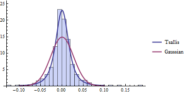 h = Histogram[goog, 30, "PDF"]; pdfs = Plot[{PDF[edist1, x], PDF[edist2, x]}, {x, -0.1, .1}, PlotStyle -> Thick, PlotLegends -> {"Tsallis", "Gaussian"}]; Show[{h, pdfs}, ImageSize -> 300]