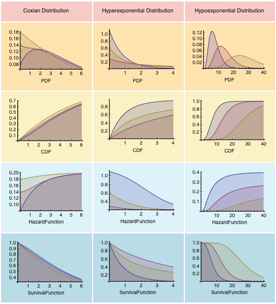 m = 150; plots = Grid[ Join[{{Style["Coxian Distribution", 11], Style[ "Hyperexponential Distribution", 11], Style["Hypoexponential Distribution", 11]}}, Transpose[{CoxianDist [#, m] & /@ {PDF, CDF, HazardFunction, SurvivalFunction}, HyperexpDist[#, m] & /@ {PDF, CDF, HazardFunction, SurvivalFunction}, HypoexpDist[#, m] & /@ {PDF, CDF, HazardFunction, SurvivalFunction}}]], BaseStyle -> {FontFamily -> "Helvetica", FontSize -> 10}, Dividers -> All, Spacings -> {1, 3}, ItemSize -> 21, Background -> {None, Lighter[#, .6] & /@ ColorData[24, "ColorList"][[1 ;; 6]]}, BaseStyle -> {FontFamily -> "Helvetica"}, FrameStyle -> Directive[Thick, White]]