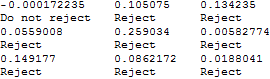 Partition[ Table[Column@ HoeffdingDTest[ Sequence @@ Transpose@data[[All, i]], {"TestStatistic", "ShortTestConclusion"}], {i, 9}], 3] // TableForm