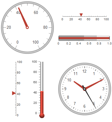 Grid[{{AngularGauge[42, {0, 100}], Column[{HorizontalGauge[42, {0, 100}], BulletGauge[42, {0, 100}]}, Spacings -> {0, 3}]}, {Grid[{{VerticalGauge[42, {0, 100}], ThermometerGauge[42, {0, 100}]}}, Spacings -> {1, 0}], ClockGauge[{10, 10, 25}]}}]
