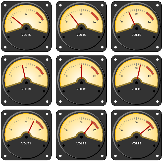 Voltmeter[v_, opts___] := Graphics[{{(*case*){EdgeForm[{Thickness[.007], GrayLevel[0]}], GrayLevel[.2], Rectangle[{-1.2, -1.1}, {1.2, 1.3}, RoundingRadius -> .2]},(*case holes*){White, Disk[{-1, -.9}, .05], Disk[{1, -.9}, .05], Disk[{1, 1.1}, .05], Disk[{-1, 1.1}, .05]},(*case outer rim*){Black, Disk[{0, .1}, 1.15], GrayLevel[.5], Disk[{-.02, .12}, 1.13], GrayLevel[.2], Disk[{0, .1}, 1.11]},(*face highlight*) EdgeForm[{CapForm["Round"], Thickness[.02], Hue[.125, .7, .6]}], Hue[.125, 1, 1], Disk[{.02, .1}, 1, {1.1 Pi, -.1 Pi}],(*face shadow*){EdgeForm[{CapForm["Round"], Thickness[.01], Hue[.125, 1, 1]}], Hue[.125, 1, 1], Disk[{-.02, .12}, 1, {1.1 Pi, -.1 Pi}]},(*face*){EdgeForm[], Hue[.125, .5, 1], Rotate[Polygon[({.1, -.04} + # &) /@ Flatten[{{{0, 0}, {0, 1}}, Array[{Sin[2 Pi*(#/50)], Cos[2 Pi*(#/50)]} &, 30]}, 1], VertexColors -> Flatten[{Hue[.125, 0, 1], Array[Hue[.125, .5, 1] &, 50 + 1]}]], 30/50 Pi, {0, 0}]},(*case mid line highlight*){Hue[.125, .7, .6], Thickness[.025], CapForm["Round"], Line[{{-.95, -.2}, {0, .1}, {.95, -.2}}]},(*case mid disk \ highlight*){Hue[.125, .7, .6], Disk[{0, 0}, .25, {.95 Pi, .05 Pi}]}}, Inset[ AngularGauge[v, {0, 100}, GaugeFaceStyle -> None, GaugeFrameStyle -> None, GaugeMarkers -> Graphics[{Hue[0, 1, .7], Polygon[{{.1, .03}, {.1, -.03}, {.95, -.03}, {1, 0}, {.95, .03}}]}], GaugeLabels -> {Placed[ Style["VOLTS", FontFamily -> "Helvetica", Bold, FontSize -> Scaled[.08], White], {.5, .35}]}, LabelStyle -> Directive[FontFamily -> "Helvetica", FontSize -> Scaled[.06]], ScaleOrigin -> {{.85 Pi, .15 Pi}, .9}, ScaleDivisions -> {2, 10}, ScaleRanges -> {{Scaled[.75], Scaled[1]}}, ScaleRangeStyle -> Hue[0, 1, .7, .7], AxesStyle -> Opacity[0], TicksStyle -> {Thickness[.01], Thickness[.005]}, ImageSize -> Automatic, ImagePadding -> None], {0, 0}, {0, 0}, {1.75, Automatic}], {(*case mid disk*)GrayLevel[.2], Disk[{0, 0}, .2], GrayLevel[0], Disk[{0, 0}, .075], Disk[{-.85, -.4}, .05], Disk[{.85, -.4}, .05]}}, PlotRangeClipping -> True, opts];