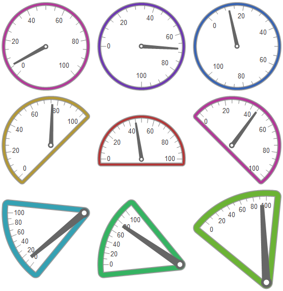 Grid[Table[ AngularGauge[RandomInteger[100], {0, 100}, GaugeFrameStyle -> Hue[(start - delta)/6, 0.7, 0.7], GaugeStyle -> GrayLevel[0.4], ScaleOrigin -> {start, start - delta}], {delta, {3 \[Pi]/2, \[Pi], \[Pi]/ 4}}, {start, {5 \[Pi]/4, \[Pi], 3 \[Pi]/4}}]]