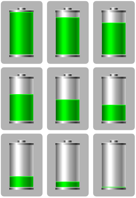 Grid[Partition[Table[BatteryGauge[i], {i, 100, 0, -12.5}], 3]]