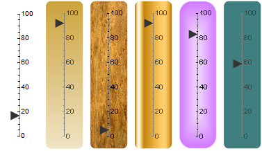 vstyles = VerticalGauge[RandomInteger[{1, 100}], {0, 100}, GaugeStyle -> GrayLevel[0.2], GaugeFaceStyle -> #, TicksStyle -> Black] & /@ {None, Texture[ExampleData[{"ColorTexture", "YellowMarble"}]], Texture[ImageCrop[ Blur@Image[ Graphics[ Table[{Lighter[RGBColor[0.819715, 0.483345, 1], 3 i], Rectangle[{2 i, 4 i}, {1 - 2 i, 4 - 4 i}, RoundingRadius -> (1 - 4 i)/3]}, {i, 0, 0.2, 0.01}]]]]]};