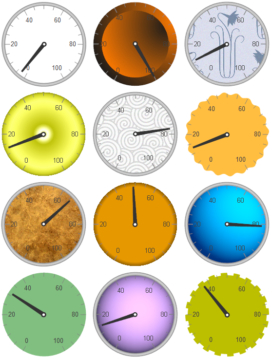 styles = AngularGauge[RandomInteger[{1, 100}], {0, 100}, GaugeStyle -> GrayLevel[0.2], GaugeFaceStyle -> #] & /@ Flatten[{None, Table[fs[[a]], {a, {11, 27}}], {Texture[ ExampleData[{"ColorTexture", "YellowMarble"}]], Texture[ImageCrop[ Graphics3D[{Sphere[]}, Lighting -> {{"Ambient", Hue[.6, 1, .5]}, {"Directional", Hue[.5, 1, .7], ImageScaled[{1, 1, 2}]}}, Boxed -> False]]], Texture[ ImageCrop[ Graphics3D[{Sphere[]}, Lighting -> {{"Ambient", Hue[.65, .5, .2]}, {"Directional", Hue[.8, .3, 1], ImageScaled[{.5, .5, 5}]}}, Boxed -> False]]]}}];