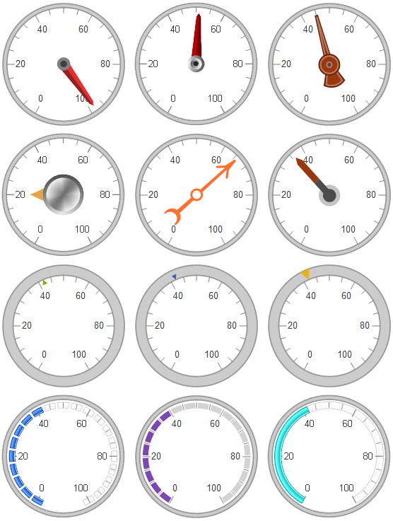 needles = Table[AngularGauge[RandomInteger[{1, 100}], {0, 100}, GaugeMarkers -> m, GaugeStyle -> RandomChoice[ColorData[67, "ColorList"]]], {m, ChartElementData["AngularGauge", "Markers"][[{2, 3, 6, 16, 18, 20}]]}];