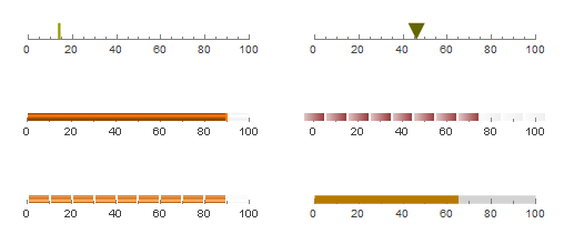 bars = Grid[ Partition[ Join[Table[ HorizontalGauge[RandomInteger[{10, 90}], {0, 100}, GaugeMarkers -> m, GaugeStyle -> RandomChoice[ColorData[85, "ColorList"]], ImageSize -> 250], {m, ChartElementData["HorizontalGauge", "Markers"][[{2, 9}]]}], MapThread[ HorizontalGauge[RandomInteger[{50, 100}], {0, 100}, GaugeMarkers -> Placed[##1], ScaleDivisions -> {5, 2}, GaugeStyle -> RandomChoice[ColorData[85, "ColorList"]], ImageSize -> 250] &, {ChartElementData["HorizontalGauge", "Markers"][[{3, 4, 5, 10}]], {"Scale", "DivisionCenter", "DivisionInterval", "Scale"}}]], 2]]