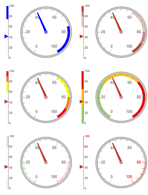 gauges2 = {AngularGauge[42, {0, 100}, ScaleRanges -> {75, 100}, GaugeStyle -> Blue], AngularGauge[42, {0, 100}, ScaleRanges -> {{60, 80}, {80, 90}, {90, 100}}], AngularGauge[42, {0, 100}, ScaleRanges -> {{60, 80}, {80, 90}, {90, 100}}, ScaleRangeStyle -> {Yellow, Orange, Red}], AngularGauge[42, {0, 100}, ScaleRanges -> {{0, 33} -> Hue[.25, .5, .8], {33, 66} -> Hue[.125, 1, 1], {66, 100} -> Hue[0, 1, .9]}], AngularGauge[42, {0, 100}, ScaleRanges -> {{0, 20} -> LightGreen, {80, 100} -> LightRed}], AngularGauge[42, {0, 100}, ScaleRanges -> {80, 100}, ScaleRangeStyle -> {None, Red}]};