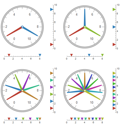 Grid[Partition[ Table[Grid[{{AngularGauge[Range[1, 9, 8/n], {0, 10}], VerticalGauge[Range[1, 9, 8/n], {0, 10}]}, {HorizontalGauge[ Range[1, 9, 8/n], {0, 8}], SpanFromAbove}}], {n, {1, 2, 5, 10}}], 2]]