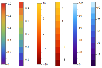 Row[{BarLegend["Rainbow"], BarLegend["Rainbow", Range[0, 1, 1/10]], BarLegend[{"SolarColors", {-10, 10}}], BarLegend[{"SolarColors", {-10, 10}}, Range[-10, 10, 2]], BarLegend[{"DeepSeaColors", {0, 100}}], BarLegend[{"DeepSeaColors", {0, 100}}, 10]}, Spacer[10]]