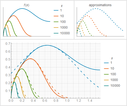 approximations = Plot[Table[(8 E x)^(-1/ 8) Exp[-(2 Sqrt[2] Sqrt[x] - 1) (t - ArcSin[(8 x)^(-1/4)])^2], {x, xlist}] // Evaluate, {t, 0, Pi/2}, PlotStyle -> (Directive[Thick, Dashing[{0.02, 0.03}], #] & /@ ColorData[68, "ColorList"]), PlotLabel -> Style["approximations", labelstyle], Evaluate@styleoptions]