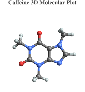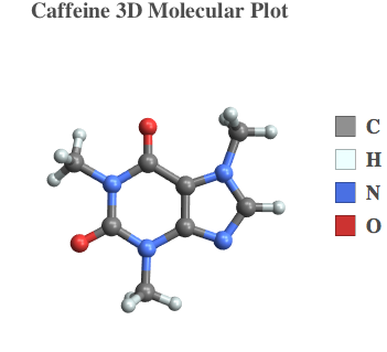 caffeine = Show[ChemicalData["Caffeine", "MoleculePlot"], PlotLabel -> Style["Caffeine 3D Molecular Plot", 20], LabelStyle -> {GrayLevel[0.3], Bold}]