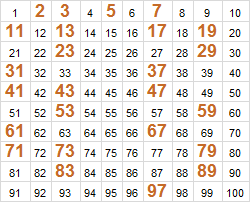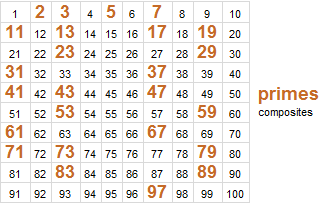 primesgrid = Grid[Partition[ Table[If[PrimeQ[i], Style[i, Bold, 18, RGBColor[0.77, 0.42, 0.16]], Style[i, "Text" ]], {i, 1, 100}], 10], BaseStyle -> {FontFamily -> "Helvetica"}, Frame -> All, FrameStyle -> LightGray]