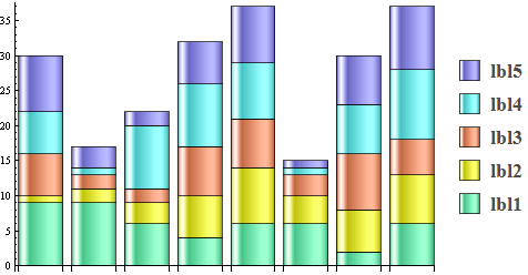 BarChart[RandomChoice[Range[1, 10], {8, 5}], ChartLayout -> "Stacked", ChartStyle -> 88, ImageSize -> 400, ChartElementFunction -> "GlassRectangle", ChartLegends -> SwatchLegend[Row[{"lbl", #}] & /@ Range[5], LegendMarkerSize -> 20, LegendMarkers -> "GlassRectangle", LabelStyle -> {GrayLevel[0.3], Bold, 18}]]