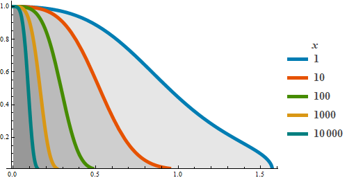 Plot[Table[ Sqrt[Cos[t]] Exp[-x Sin[t]^4], {x, {1, 10, 100, 1000, 10000}}] // Evaluate, {t, 0, Pi/2}, Evaluate@styles, PlotLegends -> LineLegend[{1, 10, 100, 1000, 10000}, LegendMarkerSize -> {30, 10}, LegendLabel -> x, LabelStyle -> {GrayLevel[0.3], Bold, 16}]]