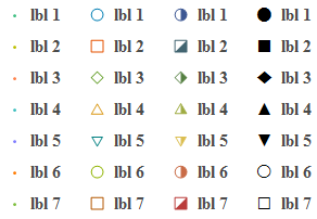 markers1 = {{\!\(\* GraphicsBox[ {EdgeForm[None], {GrayLevel[1], DiskBox[{0, 0}]}, {Thickness[0.1], CircleBox[{0, 0}]}}, ImageSize->15]\), 0.06}, {\!\(\* GraphicsBox[ {EdgeForm[None], {GrayLevel[1], RectangleBox[{0, 0}]}, {Thickness[0.1], LineBox[{{0, 0}, {1, 0}, {1, 1}, {0, 1}, {0, 0}}]}}, ImageSize->15]\), 0.06}, {\!\(\* GraphicsBox[ {EdgeForm[None], {GrayLevel[1], PolygonBox[{{0.5, 0}, {1, 0.5}, {0.5, 1}, {0, 0.5}}]}, {Thickness[0.1], LineBox[{{0.5, 0}, {1, 0.5}, {0.5, 1}, {0, 0.5}, {0.5, 0}}]}}, ImageSize->15]\), 0.07}, {\!\(\* GraphicsBox[ {EdgeForm[None], {GrayLevel[1], EdgeForm[None], PolygonBox[{{0, 0.067}, {1, 0.067}, {0.5, 0.933}}]}, {Thickness[0.1], LineBox[{{0, 0.067}, {1, 0.067}, {0.5, 0.933}, {0, 0.067}}]}}, ImageSize->15]\), 0.07}, {\!\(\* GraphicsBox[ {EdgeForm[None], {Opacity[0], EdgeForm[None], RectangleBox[{0, 0}, {1, 1.2}]}, {GrayLevel[1], PolygonBox[{{0, 0.933}, {1, 0.933}, {0.5, 0.067}}]}, {Thickness[0.1], LineBox[{{0, 0.933}, {1, 0.933}, {0.5, 0.067}, {0, 0.933}}]}}, ImageSize->15]\), 0.07}}; markers2 = {{\!\(\* GraphicsBox[ {EdgeForm[None], {GrayLevel[1], DiskBox[{0, 0}]}, DiskBox[{0, 0}, 1, NCache[{Rational[1, 2] Pi, Rational[-1, 2] Pi}, { 1.5707963267948966`, -1.5707963267948966`}]], {Thickness[0.1], CircleBox[{0, 0}]}}, ImageSize->15]\), 0.06}, {\!\(\* GraphicsBox[ {EdgeForm[None], {GrayLevel[1], RectangleBox[{0, 0}]}, PolygonBox[{{0, 0}, {1, 0}, {1, 1}}], {Thickness[0.1], LineBox[{{0, 0}, {1, 0}, {1, 1}, {0, 1}, {0, 0}}]}}, ImageSize->15]\), 0.06}, {\!\(\* GraphicsBox[ {EdgeForm[None], {GrayLevel[1], PolygonBox[{{0.5, 0}, {1, 0.5}, {0.5, 1}, {0, 0.5}}]}, PolygonBox[{{0.5, 0}, {1, 0.5}, {0.5, 1}}], {Thickness[0.1], LineBox[{{0.5, 0}, {1, 0.5}, {0.5, 1}, {0, 0.5}, {0.5, 0}}]}}, ImageSize->15]\), 0.07}, {\!\(\* GraphicsBox[ {EdgeForm[None], {Opacity[0], RectangleBox[{0, -0.1}, {1, 1}]}, {Opacity[0], RectangleBox[{0, -0.1}, {1, 1}]}, {GrayLevel[1], PolygonBox[{{0, 0.067}, {1, 0.067}, {0.5, 0.933}}]}, PolygonBox[{{0.5, 0.067}, {1, 0.067}, {0.5, 0.933}}], {Thickness[0.1], LineBox[{{0, 0.067}, {1, 0.067}, {0.5, 0.933}, {0, 0.067}}]}}, ImageSize->15]\), 0.07}, {\!\(\* GraphicsBox[ {EdgeForm[None], {Opacity[0], RectangleBox[{0, 0}, {1, 1.2}]}, {GrayLevel[1], PolygonBox[{{0, 0.933}, {1, 0.933}, {0.5, 0.067}}]}, PolygonBox[{{0.5, 0.933}, {1, 0.933}, {0.5, 0.067}}], {Thickness[0.1], LineBox[{{0, 0.933}, {1, 0.933}, {0.5, 0.067}, {0, 0.933}}]}}, ImageSize->15]\), 0.07}}; labels = Array[Row[{"lbl ", #1}] &, 7]; Row[{PointLegend[88, labels, LegendMarkerSize -> {15, 15}, LabelStyle -> {GrayLevel[0.3], Bold, 16}], PointLegend[68, labels, LegendMarkers -> markers1, LegendMarkerSize -> {15, 15}, LabelStyle -> {GrayLevel[0.3], Bold, 16}], PointLegend["DarkRainbow", labels, LegendMarkers -> markers2, LegendMarkerSize -> {15, 15}, LabelStyle -> {GrayLevel[0.3], Bold, 16}], PointLegend[Table[Black, {7}], labels, LegendMarkerSize -> {15, 15}, LegendMarkers -> {{Automatic, 20}}, LabelStyle -> {GrayLevel[0.3], Bold, 16}]}, Spacer[10]]