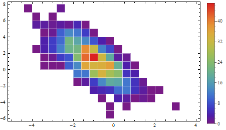 SeedRandom[3]; DensityHistogram[ RandomVariate[ MultinormalDistribution[{-1, 1}, {{1, -1.4}, {-1.4, 4}}], 1000], {{1/2.5}, {1}}, ChartBaseStyle -> EdgeForm[Directive[Opacity[0.5], White]], PlotRange -> {{-5, 4}, {-6, 8}}, ColorFunction -> "Rainbow", ImageSize -> 400, AspectRatio -> 1/GoldenRatio, ChartLegends -> Placed[Automatic, Right]]