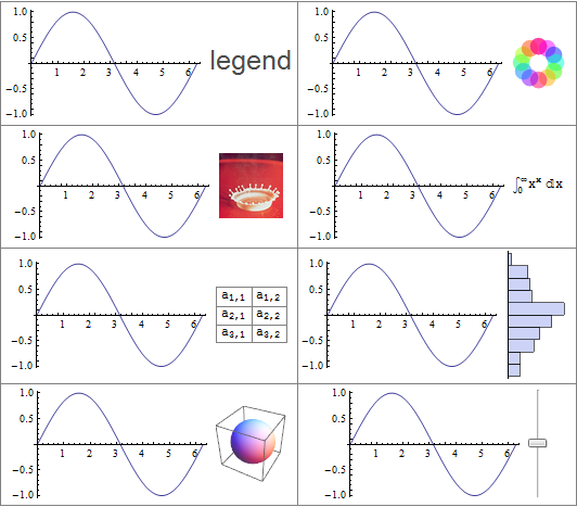 text = Style["legend", FontFamily -> "Arial", 25, GrayLevel[0.3]]; graphics = Graphics[Table[{Hue[i/2 \[Pi]], Opacity[0.5], Disk[{Sin[i], Cos[i]}, 0.5]}, {i, 0, 2 \[Pi], \[Pi]/6}], ImageSize -> 50]; table = Grid[Array[Subscript[a, ##] &, {3, 2}], Frame -> All, FrameStyle -> Gray]; graphics3d = Graphics3D[Sphere[], ImageSize -> 65]; image = ImageCrop[ ImageResize[ExampleData[{"TestImage", "Splash"}], 70], 60]; control = VerticalSlider[ImageSize -> Small]; plot = Histogram[ Table[RandomReal[{0, 10}] Sin[x], {x, 0, 2 \[Pi], 0.05}], BarOrigin -> Left, AspectRatio -> 2, ImageSize -> 60, Axes -> {False, True}, Ticks -> None]; formula = HoldForm[Integrate[x^x, {x, 0, Infinity}]];