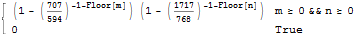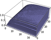 DiscretePlot3D[ CDF[\[ScriptCapitalD], {m, n}] // Evaluate, {m, 0, 35}, {n, 0, 35}, ExtentSize -> Right, PlotRange -> {0, 1.05}]