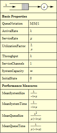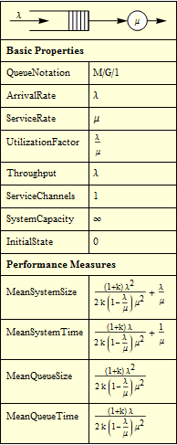 QueueProperties[ QueueingProcess[\[Lambda], ErlangDistribution[k, k \[Mu]]]]