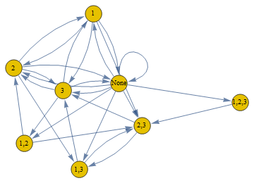 . После обработки на станке под номером 1 продукция переходит к станкам под номером 2 и 3, поэтому, если первый станок выходит из строя, механический цех в тот день не производит никакой продукции. В течение рабочего дня ремонтная бригада в состоянии устранить неисправность только одного станка, вернув его в рабочее состояние к началу следующего рабочего дня. Если более чем один станок неисправен, ремонт производится в очерёдности - первый, второй, третий. Предполагается, что отремонтированный станок остаётся в рабочем состоянии на следующий день. Состояние механического цеха описывает все возможные сочетания неисправных станков, а в начальный момент времени все станки исправны. Визуализируем процесс, помечая в узлах номера станков, вышедших из строя.| Out[2]= | ![]() |