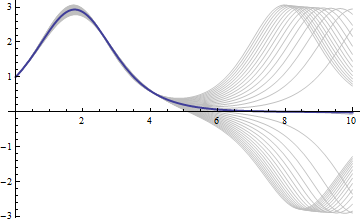 Show[{Plot[ Evaluate@Table[y[a][t] /. psol, {a, .65, .8, .005}], {t, 0, 10}, PlotStyle -> Lighter[Gray, 0.5]], Plot[Evaluate[y[a][t] /. psol /. lmin[[2]]], {t, 0, 10}, PlotStyle -> Thick]}, ImageSize -> Medium]