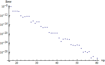 ListLogPlot[ Table[{wp, Abs[pfun[1, 1, 0, wp][4 \[Pi]] - 1]}, {wp, 16, 60}], AxesLabel -> {wp, "Error"}, ImageSize -> Medium]