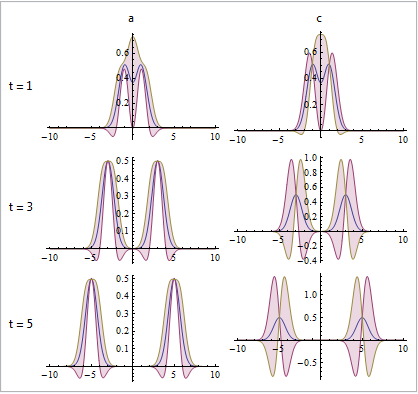 Panel@Grid[ Join[{{"", "a", "c"}}, Table[{StringJoin["t = ", ToString[\[Tau]]], Plot[Evaluate[(pfun[a, c][\[Tau], x] + .5 {0, 1, -1} D[pfun[a, c][\[Tau], x], a]) /. {a -> 1, c -> 1}], {x, -10, 10}, Filling -> {2 -> {3}}, PlotRange -> All], Plot[Evaluate[(pfun[a, c][\[Tau], x] + .5 {0, 1, -1} D[pfun[a, c][\[Tau], x], c]) /. {a -> 1, c -> 1}], {x, -10, 10}, Filling -> {2 -> {3}}, PlotRange -> All]}, {\[Tau], {1, 3, 5}}]]]