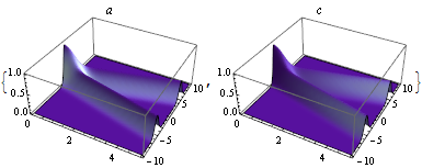 ColorSensitivityPlot3D[f_, fsense_, opts___] := Block[{fs = fsense}, Plot3D[f, {t, 0, 5}, {x, -10, 10}, Mesh -> None, ColorFunction -> Function[{t, x}, ColorData["LakeColors"][fs]], PlotPoints -> 60, ColorFunctionScaling -> False, opts]]; {ColorSensitivityPlot3D[pfun[1, 1][t, x], Abs[ifda[t, x]], PlotLabel -> a, PlotRange -> All], ColorSensitivityPlot3D[pfun[1, 1][t, x], .25 Abs[ifdc[t, x]], PlotLabel -> c, PlotRange -> All]}