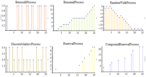 procs = {BernoulliProcess[1/3], BinomialProcess[1/3], RandomWalkProcess[1/3], DiscreteMarkovProcess[{1, 0, 0}, {{0, 1/2, 1/2}, {1/2, 0, 1/2}, {1/2, 1/2, 0}}], RenewalProcess[PascalDistribution[1, 1/3]], CompoundRenewalProcess[PascalDistribution[1, 1/3], BinomialDistribution[5, 1/2]]};