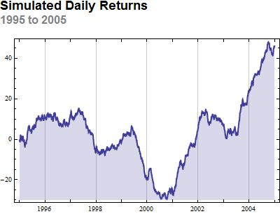 Labeled[DateListPlot[stock["Path"], PlotStyle -> Thick, ImageSize -> 400, Joined -> True, Filling -> -30], Column[{Style["Simulated Daily Returns", Bold, FontSize -> 18, FontFamily -> "Helvetica"], Style["1995 to 2005", Bold, FontSize -> 16, FontColor -> Gray, FontFamily -> "Helvetica"]}], {{Top, Left}}]