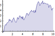 ListLinePlot[RandomFunction[WienerProcess[], {0, 10, 0.1}], Filling -> Axis, AxesOrigin -> {0, 0}]