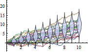 plot1 = ListLinePlot[RandomFunction[proc, {0, 10, 0.1}, 25]]; plot2 = DistributionChart[Transpose@(data["SliceData", Range[10]]), ChartStyle -> Opacity[0.7]]; Show[plot1, plot2, PlotRange -> {{0, 11}, Automatic}]