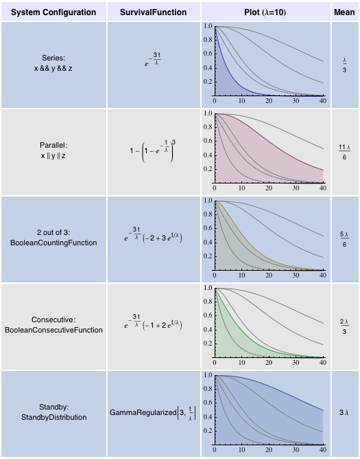 \[ScriptCapitalD] = ExponentialDistribution[1/\[Lambda]]; dists = {{x, \[ScriptCapitalD]}, {y, \[ScriptCapitalD]}, {z, \ \[ScriptCapitalD]}}; \[ScriptCapitalR]series = ReliabilityDistribution[x \[And] y \[And] z, dists]; \[ScriptCapitalR]parallel = ReliabilityDistribution[x \[Or] y \[Or] z, dists]; \[ScriptCapitalR]2OutOf3 = ReliabilityDistribution[BooleanCountingFunction[{2, 3}, {x, y, z}], dists]; \[ScriptCapitalR]consecutive = ReliabilityDistribution[BooleanConsecutiveFunction[2, 3][x, y, z], dists]; \[ScriptCapitalR]standby = StandbyDistribution[\[ScriptCapitalD], {\[ScriptCapitalD], \ \[ScriptCapitalD]}]; labels = Map[ Column[#, Center] &, {{"Series:", x \[And] y \[And] z}, {"Parallel:", x \[Or] y \[Or] z}, {"2 out of 3:", BooleanCountingFunction}, {"Consecutive:", BooleanConsecutiveFunction}, {"Standby:", StandbyDistribution}}]; distributions = {\[ScriptCapitalR]series, \[ScriptCapitalR]parallel, \ \[ScriptCapitalR]2OutOf3, \[ScriptCapitalR]consecutive, \ \[ScriptCapitalR]standby};