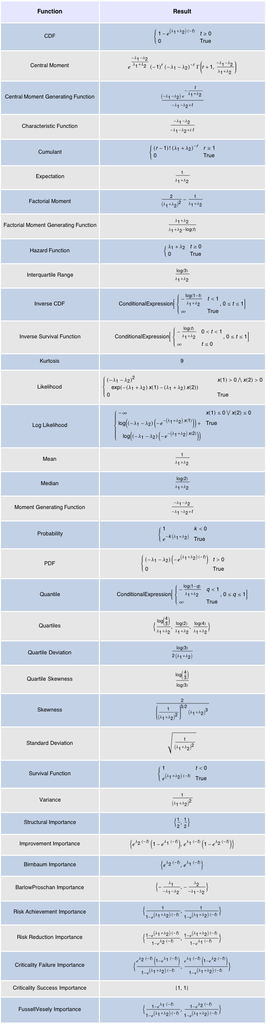 lis = {{"Function", "Result"}, {"CDF", CDF[\[ScriptCapitalR], t]}, {"Central Moment", CentralMoment[\[ScriptCapitalR], r]}, {"Central Moment Generating Function", CentralMomentGeneratingFunction[\[ScriptCapitalR], t]}, {"Characteristic Function", CharacteristicFunction[\[ScriptCapitalR], t]}, {"Cumulant", Cumulant[\[ScriptCapitalR], r]}, {"Expectation", Expectation[t, t \[Distributed] \[ScriptCapitalR]]}, {"Factorial Moment", FactorialMoment[\[ScriptCapitalR], 2]}, {"Factorial Moment Generating Function", FactorialMomentGeneratingFunction[\[ScriptCapitalR], t]}, {"Hazard Function", HazardFunction[\[ScriptCapitalR], t]}, {"Interquartile Range", InterquartileRange[\[ScriptCapitalR]]}, {"Inverse CDF", InverseCDF[\[ScriptCapitalR], t]}, {"Inverse Survival Function", InverseSurvivalFunction[\[ScriptCapitalR], t]}, {"Kurtosis", Kurtosis[\[ScriptCapitalR]]}, {"Likelihood", Likelihood[\[ScriptCapitalR], Array[x, 2]]}, {"Log Likelihood", LogLikelihood[\[ScriptCapitalR], Array[x, 2]]}, {"Mean", Mean[\[ScriptCapitalR]]}, {"Median", Median[\[ScriptCapitalR]]}, {"Moment Generating Function", MomentGeneratingFunction[\[ScriptCapitalR], t]}, {"Probability", Probability[t > k, t \[Distributed] \[ScriptCapitalR]]}, {"PDF", PDF[\[ScriptCapitalR], t]}, {"Quantile", Quantile[\[ScriptCapitalR], q]}, {"Quartiles", Quartiles[\[ScriptCapitalR]]}, {"Quartile Deviation", QuartileDeviation[\[ScriptCapitalR]]}, {"Quartile Skewness", QuartileSkewness[\[ScriptCapitalR]]}, {"Skewness", Skewness[\[ScriptCapitalR]]}, {"Standard Deviation", StandardDeviation[\[ScriptCapitalR]]}, {"Survival Function", SurvivalFunction[\[ScriptCapitalR], t]}, {"Variance", Variance[\[ScriptCapitalR]]}, {"Structural Importance", StructuralImportance[\[ScriptCapitalR]]}, {"Improvement Importance", ImprovementImportance[\[ScriptCapitalR], t]}, {"Birnbaum Importance", BirnbaumImportance[\[ScriptCapitalR], t]}, {"BarlowProschan Importance", BarlowProschanImportance[\[ScriptCapitalR]]}, {"Risk Achievement Importance", RiskAchievementImportance[\[ScriptCapitalR], t]}, {"Risk Reduction Importance", RiskReductionImportance[\[ScriptCapitalR], t]}, {"Criticality Failure Importance", CriticalityFailureImportance[\[ScriptCapitalR], t]}, {"Criticality Success Importance", CriticalitySuccessImportance[\[ScriptCapitalR], t]}, {"FussellVesely Importance", FussellVeselyImportance[\[ScriptCapitalR], t]}};