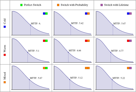 \[ScriptCapitalD] = ExponentialDistribution[1/2]; Subscript[\[ScriptCapitalD], warm] = ExponentialDistribution[1/10]; Subscript[\[ScriptCapitalD], switch] = ExponentialDistribution[1/20]; Subscript[\[ScriptCapitalD], cp] = StandbyDistribution[\[ScriptCapitalD], {\[ScriptCapitalD], \ \[ScriptCapitalD]}]; Subscript[\[ScriptCapitalD], ci] = StandbyDistribution[\[ScriptCapitalD], {\[ScriptCapitalD], \ \[ScriptCapitalD]}, 0.9]; Subscript[\[ScriptCapitalD], cil] = StandbyDistribution[\[ScriptCapitalD], {\[ScriptCapitalD], \ \[ScriptCapitalD]}, Subscript[\[ScriptCapitalD], switch]]; Subscript[\[ScriptCapitalD], wp] = StandbyDistribution[\[ScriptCapitalD], \ {{Subscript[\[ScriptCapitalD], warm], \[ScriptCapitalD]}, {Subscript[\[ScriptCapitalD], warm], \[ScriptCapitalD]}}]; Subscript[\[ScriptCapitalD], wi] = StandbyDistribution[\[ScriptCapitalD], \ {{Subscript[\[ScriptCapitalD], warm], \[ScriptCapitalD]}, {Subscript[\[ScriptCapitalD], warm], \[ScriptCapitalD]}}, 0.9]; Subscript[\[ScriptCapitalD], wil] = StandbyDistribution[\[ScriptCapitalD], \ {{Subscript[\[ScriptCapitalD], warm], \[ScriptCapitalD]}, {Subscript[\[ScriptCapitalD], warm], \[ScriptCapitalD]}}, Subscript[\[ScriptCapitalD], switch]]; Subscript[\[ScriptCapitalD], wcp] = StandbyDistribution[\[ScriptCapitalD], \ {{Subscript[\[ScriptCapitalD], warm], \[ScriptCapitalD]}, \[ScriptCapitalD]}]; Subscript[\[ScriptCapitalD], wci] = StandbyDistribution[\[ScriptCapitalD], \ {{Subscript[\[ScriptCapitalD], warm], \[ScriptCapitalD]}, \[ScriptCapitalD]}, 0.9]; Subscript[\[ScriptCapitalD], wcil] = StandbyDistribution[\[ScriptCapitalD], \ {{Subscript[\[ScriptCapitalD], warm], \[ScriptCapitalD]}, \[ScriptCapitalD]}, Subscript[\[ScriptCapitalD], switch]];