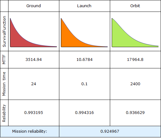 plotOpts = {PlotRange -> {0, 1}, Filling -> Axis, Ticks -> None, ImageSize -> 150, PlotRangePadding -> 0}; Grid[{{"", "Ground", "Launch", "Orbit"}, {Rotate["SurvivalFunction", \[Pi]/2], Plot[SurvivalFunction[Subscript[\[ScriptCapitalR], ground], t], {t, 0, 15000}, Evaluate@plotOpts, FillingStyle -> ColorData["Crayola"]["Mahogany"]], Plot[SurvivalFunction[Subscript[\[ScriptCapitalR], launch], t], {t, 0, 40}, Evaluate@plotOpts, FillingStyle -> Orange], Plot[SurvivalFunction[Subscript[\[ScriptCapitalR], orbit], t], {t, 0, 50000}, Evaluate@plotOpts, FillingStyle -> ColorData["Crayola"]["Inchworm"]]}, {Rotate[ "MTTF", \[Pi]/2], Mean[Subscript[\[ScriptCapitalR], ground]], Mean[Subscript[\[ScriptCapitalR], launch]], Mean[Subscript[\[ScriptCapitalR], orbit]]}, {Rotate[ "Mission time", \[Pi]/2], 24, 0.1, 100*24}, {Rotate["Reliability", \[Pi]/2], SurvivalFunction[Subscript[\[ScriptCapitalR], ground], 24], SurvivalFunction[Subscript[\[ScriptCapitalR], launch], 0.1], SurvivalFunction[Subscript[\[ScriptCapitalR], orbit], 100*24]}, {Item["Mission reliability:", Background -> LightBlue], SpanFromLeft, Item[rel, Background -> LightBlue], SpanFromLeft}}, Frame -> All, Spacings -> {1, 2}, BaseStyle -> {FontFamily -> "Verdana", FontSize -> 12}]