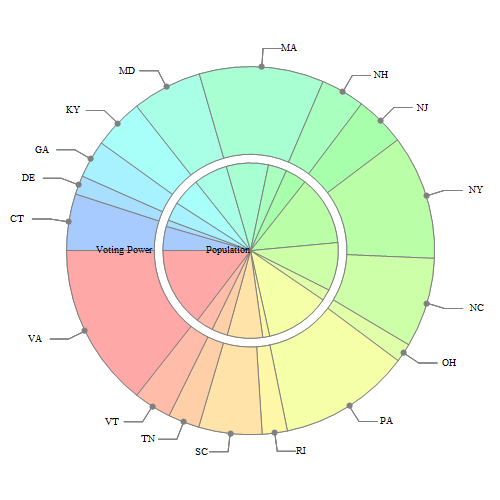 PieChart[{Labeled[population, "Population", {0, 0}], Labeled[power, "Voting Power", {0, 0}]}, SectorSpacing -> 0.1, LabelingFunction -> labeler, ImagePadding -> 20, ImageSize -> 500]