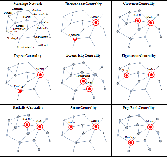 labels = Flatten[{"Marriage Network", Most[centralities], "PageRankCentrality"}]; data = Transpose[{Prepend[highlight[g, #] & /@ values, g], labels}]; Grid[Partition[ SetProperty[#1, {PlotLabel -> Style[#2, Bold], ImagePadding -> 10}] & @@@ data, 3, 3, 1, {}], Frame -> All]