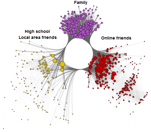 CommunityGraphPlot[SocialMediaData["Facebook", "FriendNetwork"], CommunityLabels -> {"Online friends", "High school\n Local area friends", "Family"}]