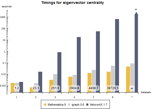 Сравнение времён нахождение центральности сети по посредничеству. Эксперимент производился на архитектуре Intel Core 2 Duo 3.06 GHz с операционной системой Mac OS X Lion, с ограничением по времени в 1000 секунд. Число, расположенное внизу, указывает во сколько раз система Mathematica 9 быстрее, чем NetworkX 1.7.