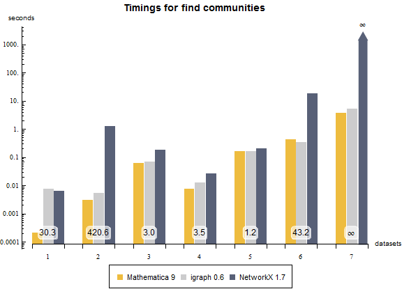 Compare timings for computing communities for networks. Experiments were performed on an Intel Core 2 Duo 3.06 GHz Mac OS X Lion system and for computations to finish in 1000 seconds. The number at the bottom tells how many times faster Mathematica 9 is compared to NetworkX 1.7.