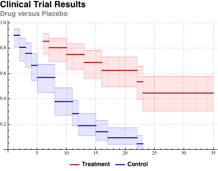 Использование команды SurvivalModelFit для визуального сравнения кривых выживаемости и их доверительных интервалов для экспериментальной и контрольной групп.