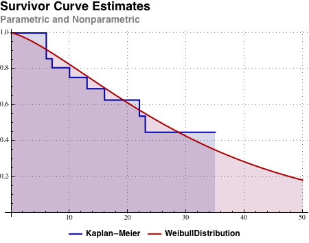 Использование методов максимального правдоподобия команды EstimatedDistribution для получения наилучшего соответствия распределения WeibullDistribution с цензурированными данными и сравнение с оценкой Каплана-Майера.