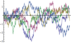 Случайные реализации траекторий процесса, построенные по схеме Милштейна.